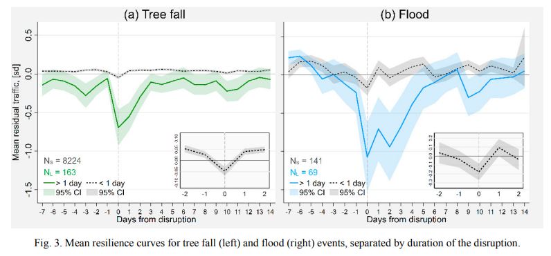 An important aspect of transport infrastructure resilience is recovery, i.e. the process of returning to original service levels after a disruption. In this paper, we estimate recovery trajectories of the German rail network for two specific types of natural hazards: floods and tree fall. Extensive traffic data on track segments of the Deutsche Bahn are matched to geospatial information on disruptive flood and tree-fall events between 2018-2020. We quantify mean resilience curves for flood and tree-fall events by taking average train counts for each day within a (–7, +14)-day window. Results suggest that traffic takes about three days on average to return to normal operations after a tree-fall disruption lasting longer than one day, while it takes five days on average to recover from a flood. Trajectories vary according to route type and are influenced by seasonal weather conditions.
